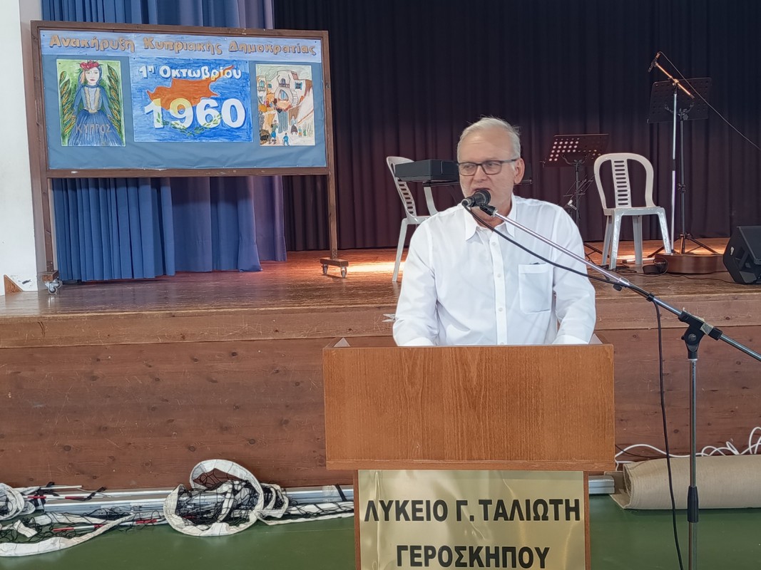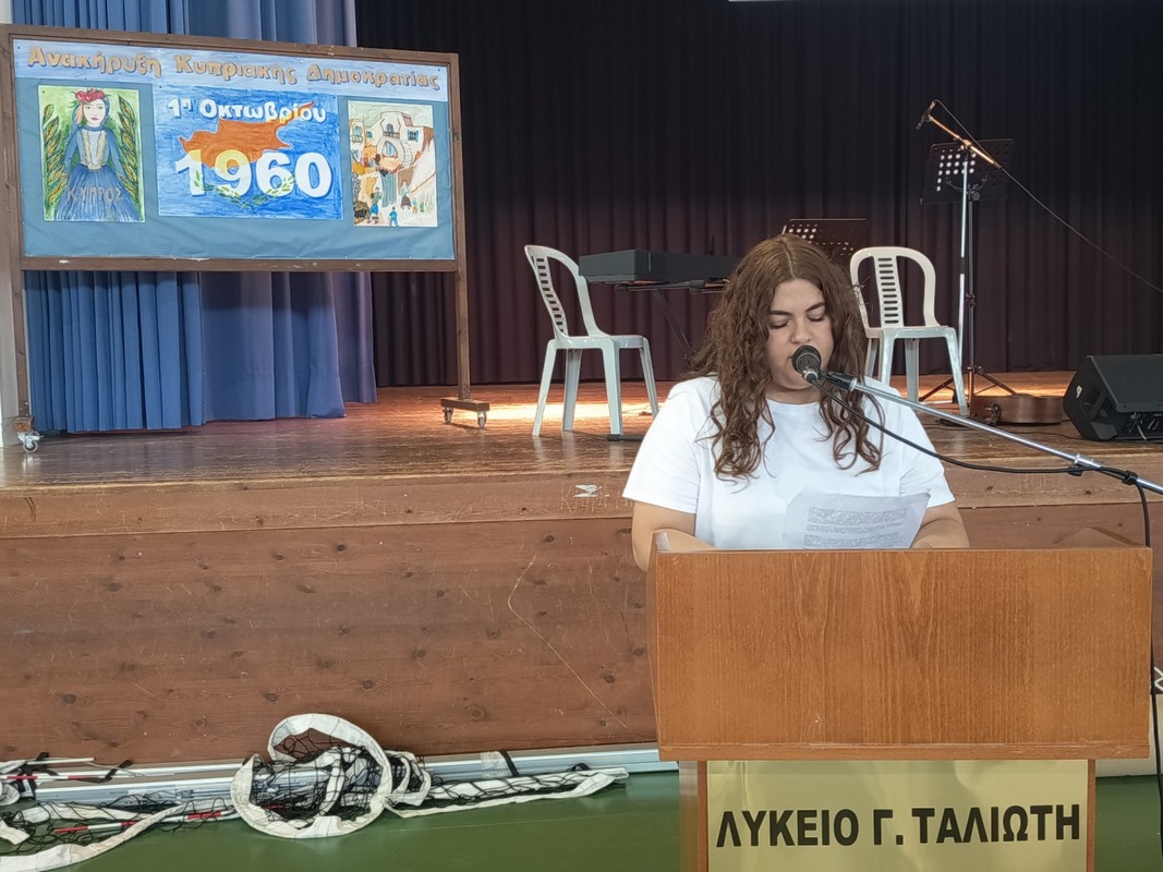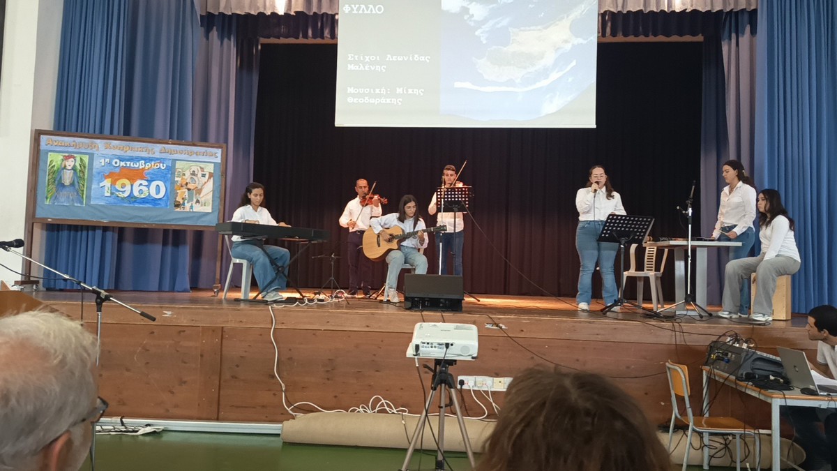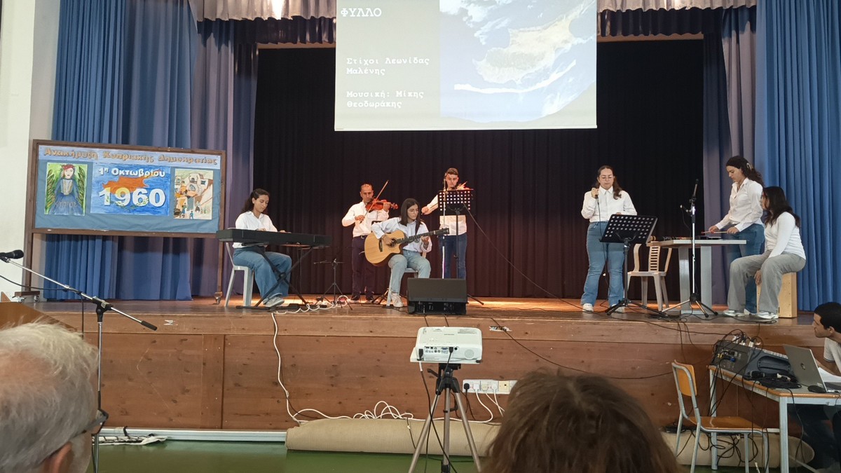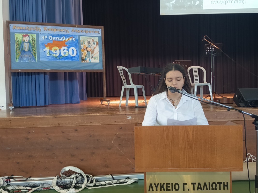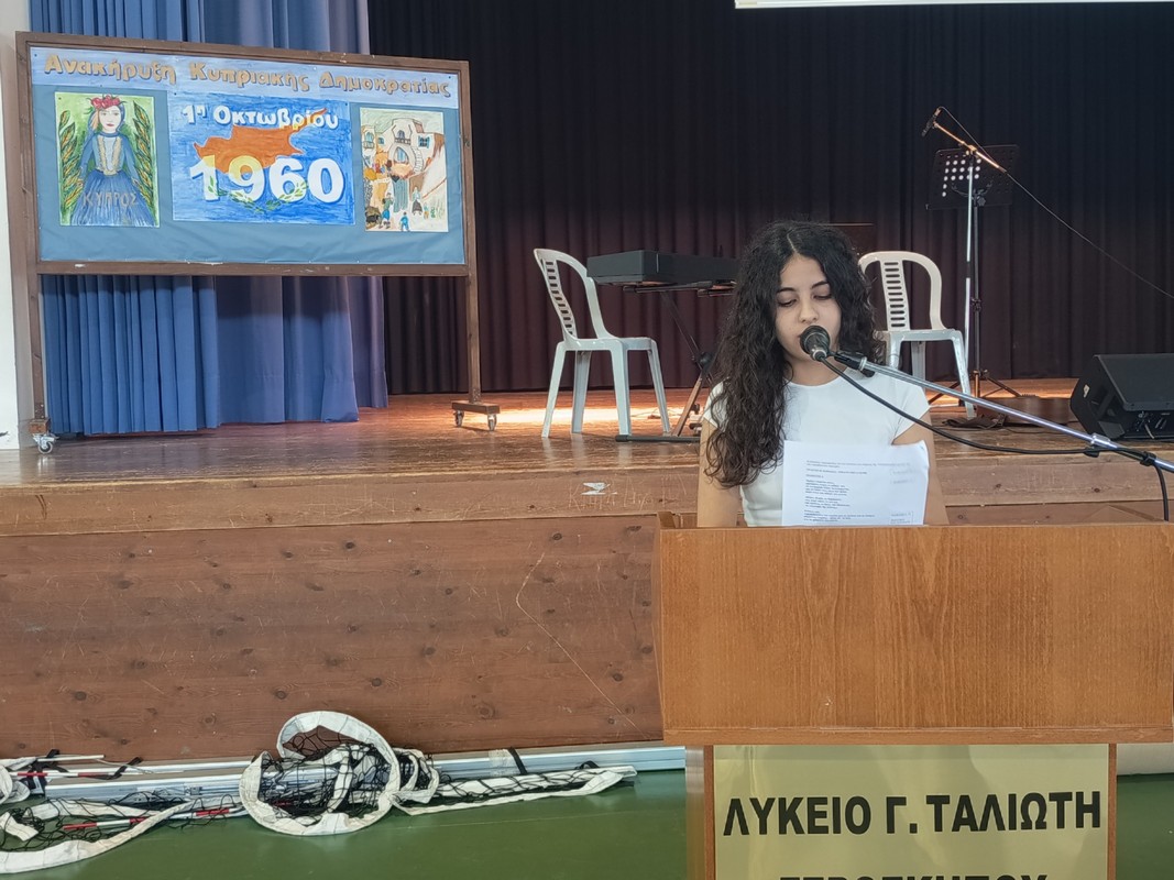 Με απαγγελίες, αναγνώσεις χρονικών και τραγούδια από το μουσικό σχήμα του Σχολείου μας, η σχολική μας κοινότητα τίμησε σήμερα με μεγάλη περηφάνια την επέτειο ανακήρυξης της Κυπριακής Ανεξαρτησίας. Στην εκδήλωση έλαβαν μέρος οι μαθήτριες Μυριάνθη Θεοφάνους του Β31, Αντρεάνα Παναγιώτου και Σαρίτα Ρουστάμ του Β11.