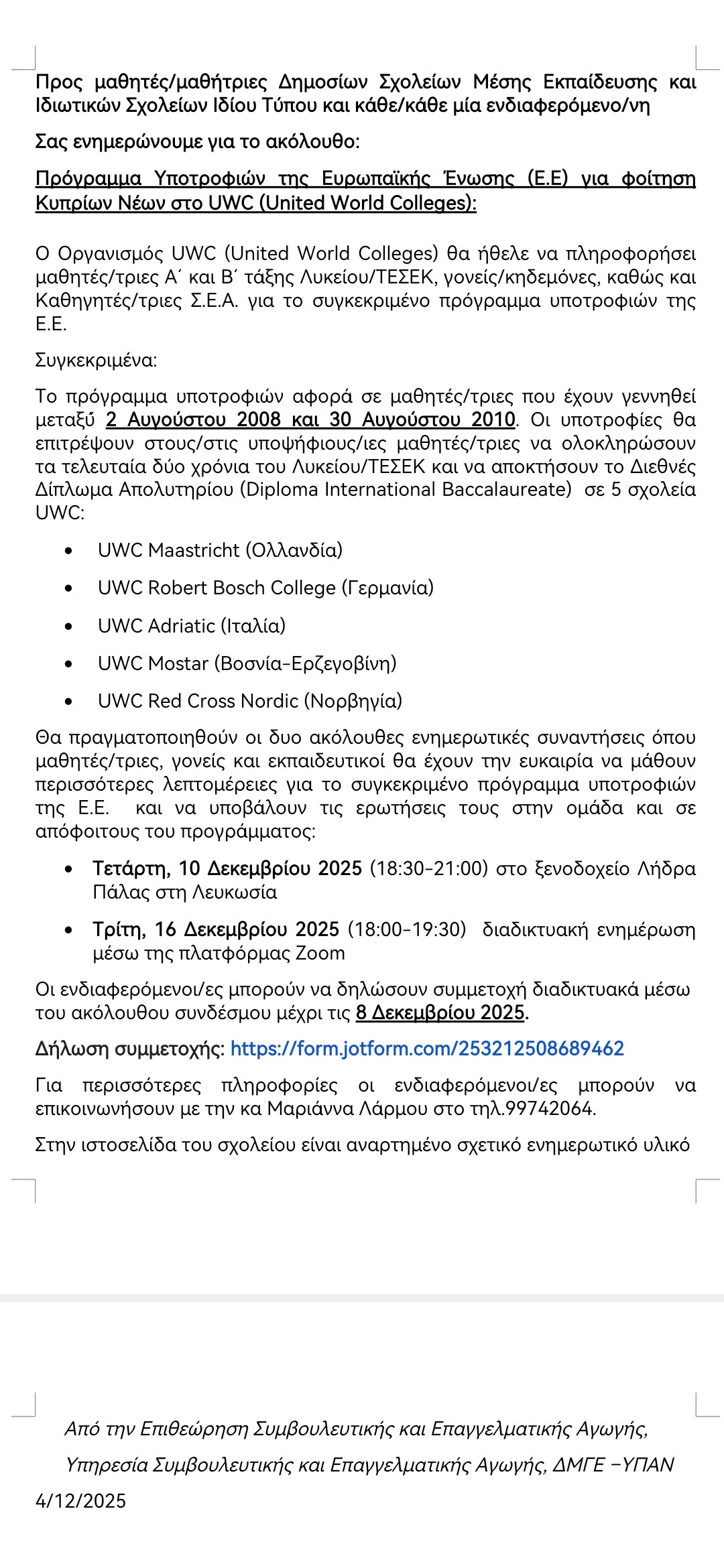 Πρόγραμμα Υποτροφιών της Ευρωπαϊκής Ένωσης (Ε.Ε) για φοίτηση Κυπρίων Νέων στο UWC (United World Colleges):